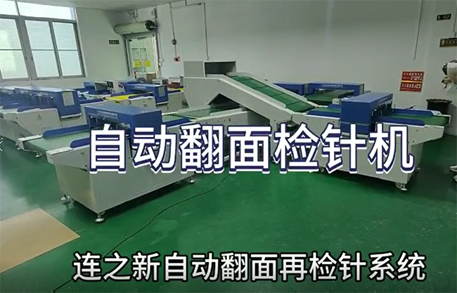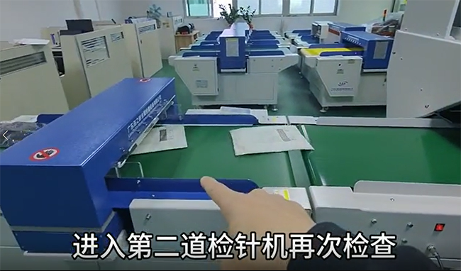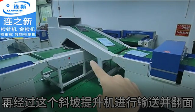 把衣服放進(jìn)檢針機(jī),經(jīng)過第一臺(tái)檢針機(jī)的檢測(cè)沒有問題后,再經(jīng)過斜坡提升機(jī)進(jìn)行輸送關(guān)翻面,翻面后,經(jīng)過輸送機(jī)輸出,進(jìn)入第二道檢針機(jī)再次檢查。