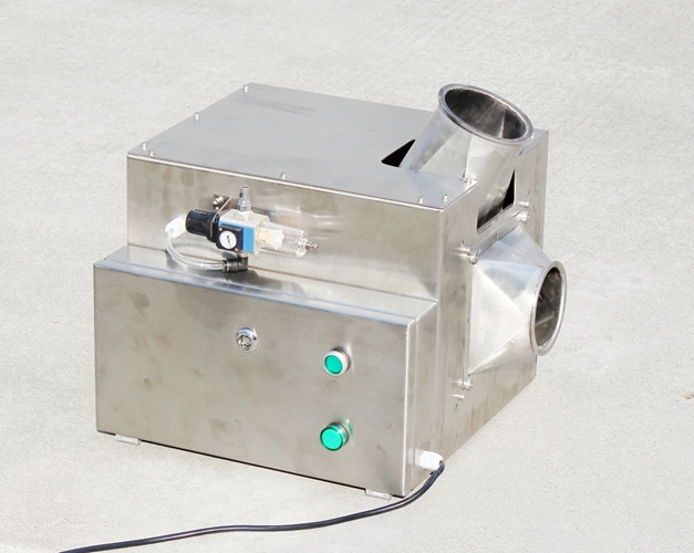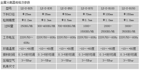 原料從料斗或送料器自由下落進(jìn)入金屬分離器,如果沒有金屬雜質(zhì),原料會直接通過金屬分離器流向下端的出料口。如果檢測器檢測到原料中含有金屬,那么控制器立刻啟動分離板將金屬物和部分原料一起導(dǎo)向側(cè)面的排料口,然后分流板迅速恢復(fù)至正常的位置,分流板速度可調(diào),金屬分離器的檢測精度也可根據(jù)生產(chǎn)需要調(diào)節(jié),最小可檢測并分離出Φ 0.2mm的金屬顆粒。